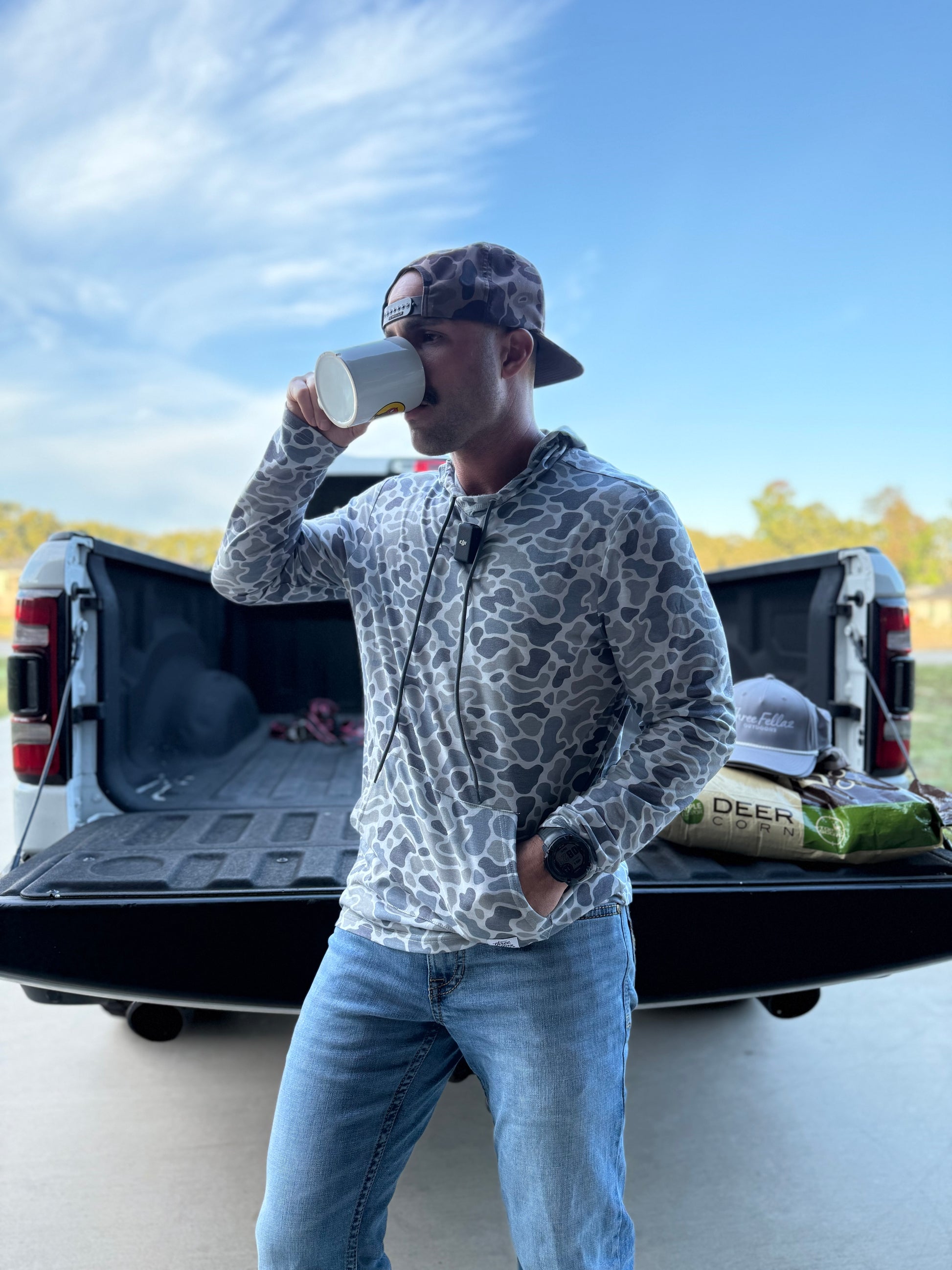 Enjoy the comfort and protection of the Three Fellaz lightweight hoodie. This hoodie offers the perfect blend of poly and rayon for lasting comfort. It was created to keep you comfortable and cool. Built with a drawstring hoodie and kangaroo pocket. Whether your out in the woods or on the water this camo blend will be your go to hoodie for it all.