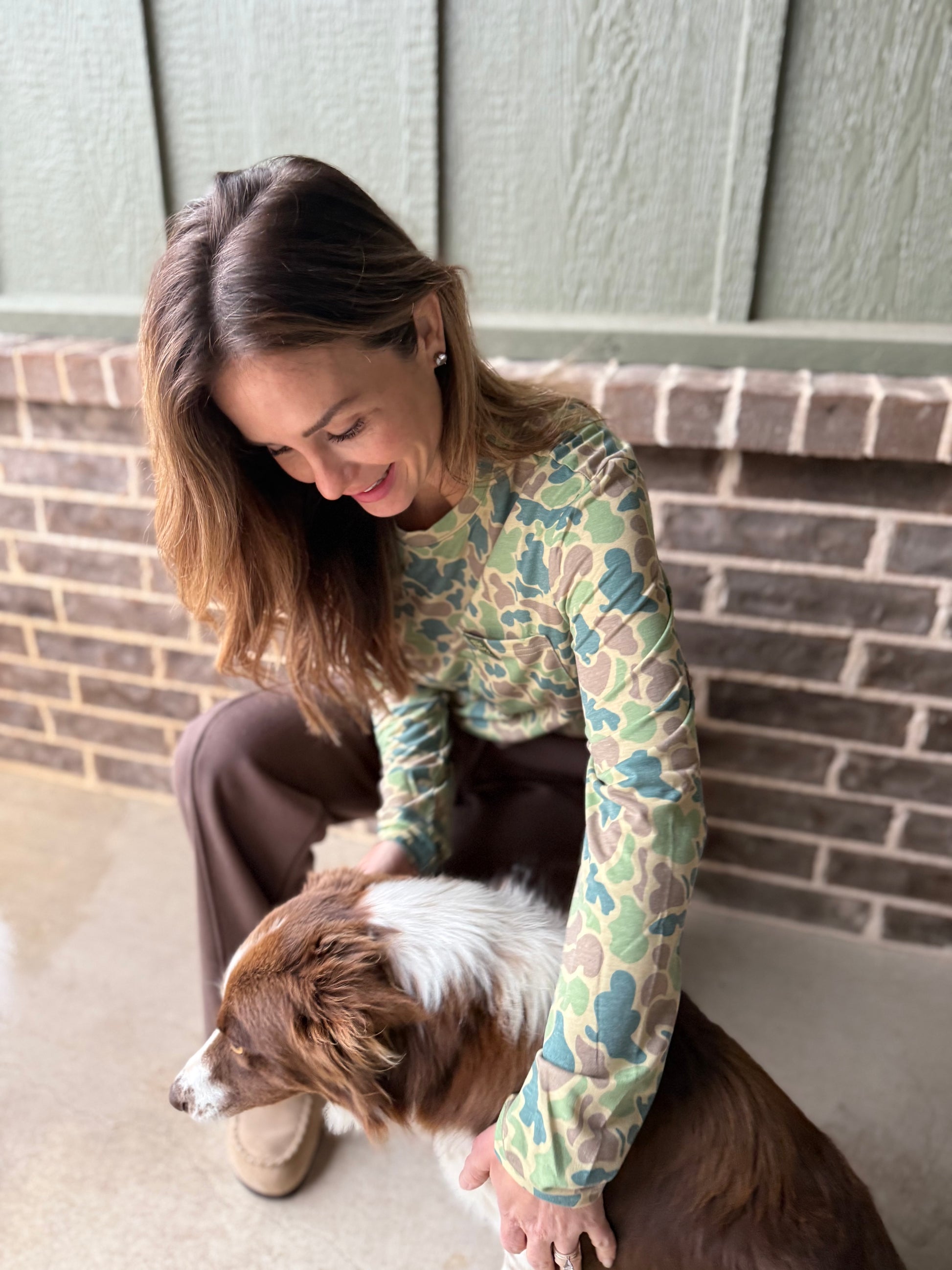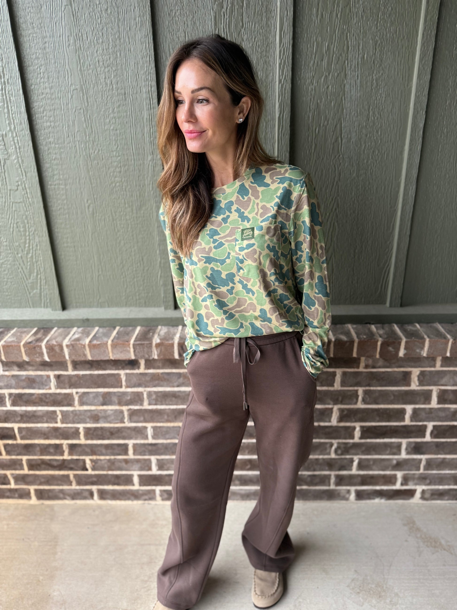 This Three Fellaz Outdoors performance long sleeve pocket tee is the perfect match for all your outdoor adventures. It comes in the Blue and Green Camouflage pattern with the Three Fellaz Outdoors woven tag on the pocket. This shirt will keep you comfortable and stylish all day long.